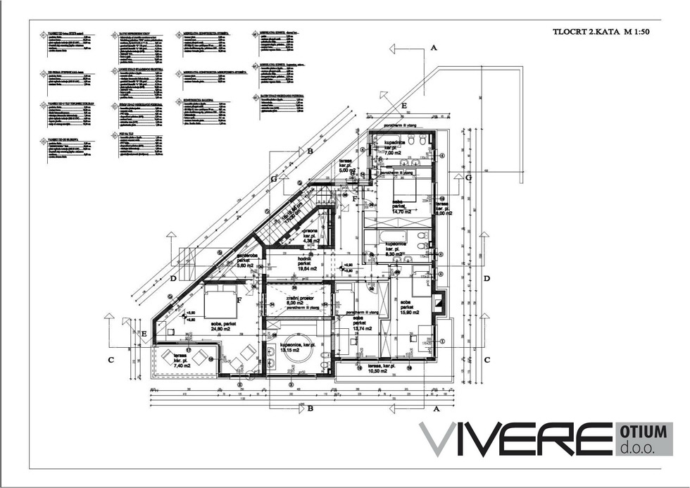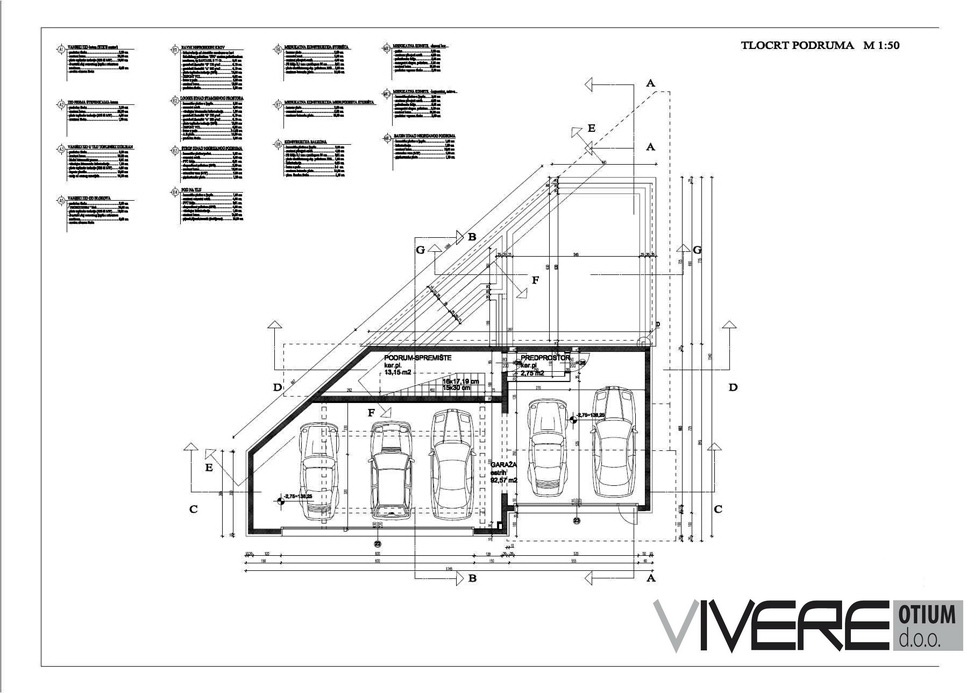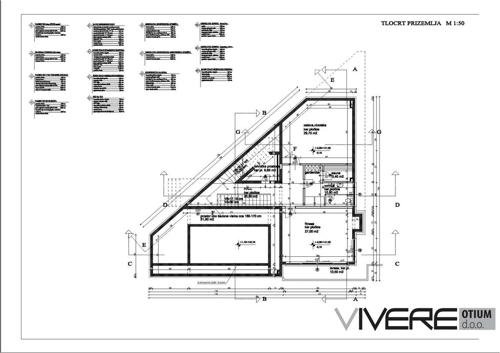 Nekretnina je ukupne stambene površine otprilike 500 m2, te se sa-stoji od tri kata i dodatnog suterena. Suteren se sastoji od pro-storije za različite potrebe kao što su sprema i sl., te ogromne garaže koja može primiti veliki broj vozila. Prizemlje nudi prostorni vinski podrum, prostoriju za tehniku i veličanstveni prostor za fitness i spa sa saunom. Glavni kat (prvi kat) obogaćen je ulaznim holom, veličanstvenim dnevnim boravkom (otprilike 80 m2) s podnim grijanjem i otvorenim kaminom, te prilazom jednako fantastičnim terasama. Prvi kat, uz to, nudi prostornu otvorenu kuhinju s blaga-vaonom, WC za goste te PANTRY. Vrhunac ove nekretnine je svakako unutarnji bazen s masažnom opremom i staklenim krovom koji se auto-matski otvara i zatvara. Bazenu se pristupa izravno iz dnevnog bo-ravka, a zbog ogromnih staklenih stijenki pruža zadivljujući pogled. Uokolo bazena su postavljene najizvrsnije pločice te se pod njima nalazi podno grijanje. Spavaće sobe i praonica su pronašle svoje mjesto na drugom katu. Glavna spavaća soba ima svoju vlastitu svla-čionicu, natkrivenu terasu te en-suite kupaonu s jacuzzijem i tuš kabinom. Druga bračna soba također posjeduje svoju vlastitu kupaonu, dok posljednje dvije spavaće sobe dijele treću kupaonu. Sve spavaće sobe imaju pristup velikim natkrivenim terasama. Iz glavne spavaće sobe, druge spavaće sobe te hodnika se pruža pogled na bazen koji se nalazi kat ispod.