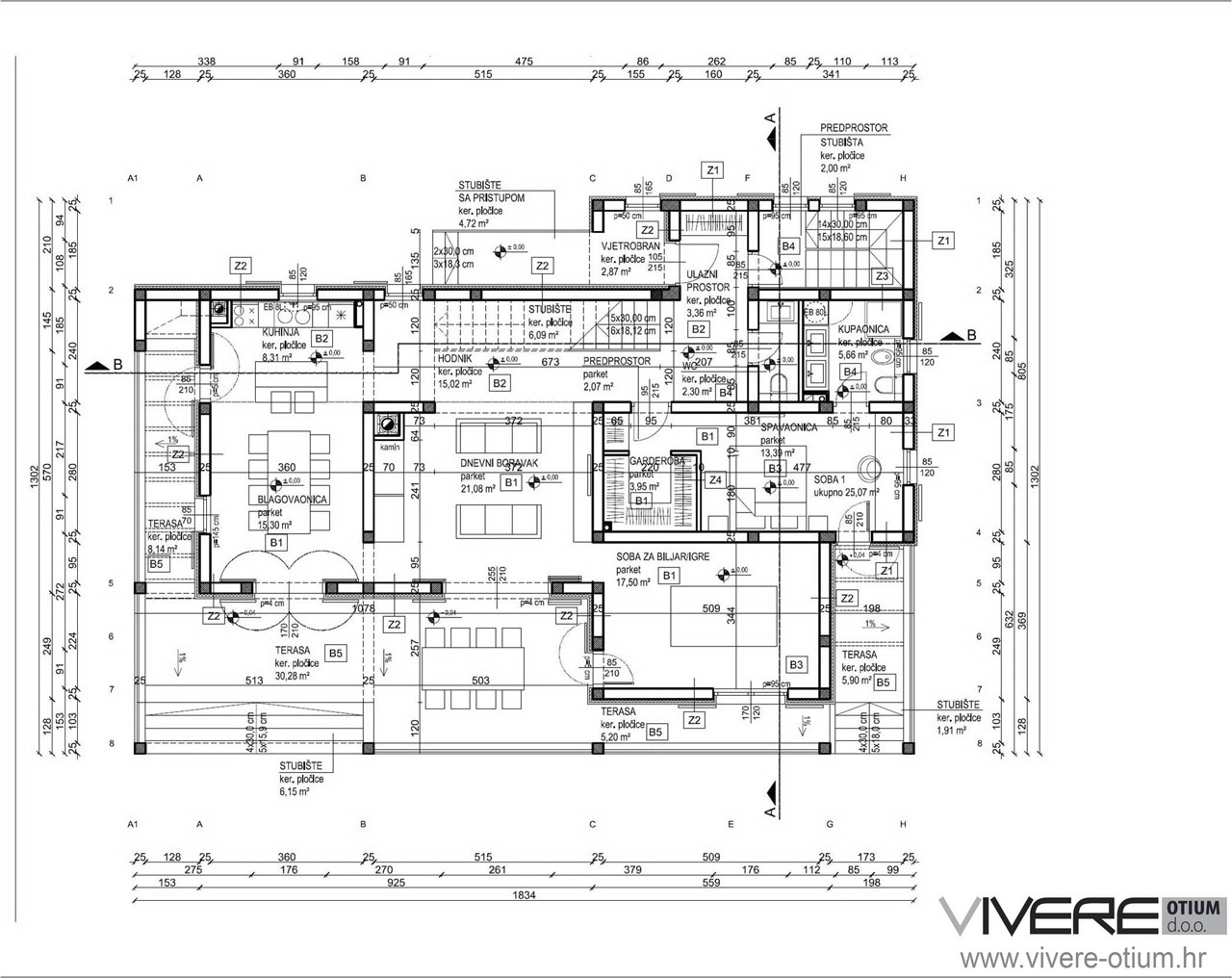 Das Haus im traditionellen dalmatinischen Stil ist auf drei Etagen aufgeteilt. Im Erdgeschoss befinden sich eine Küche mit Essbereich und ein Wohnzimmer mit Kamin und angrenzenden Freizeitraum mit Billardtisch. Auf der gleichen Etage finden Sie ein großzügiges Schlafzimmer mit begehbaren Kleiderschrank und en suite Badezimmer sowie eine Gädtetoilette im Eingangsbereich der Immobilie. Alle Zimmer im Erdgeschoß öffnen sich zu einer herrlichen, überdachten Veranda mit Tischen und Sitzgelegenheiten. Ideal als Schattenplatz im Sommer oder als windgeschützter Platz für die Wintertage. Eine Außentreppe führt von dieser Ebene zur Poolebene mit großzügigen Pool (35 m²) und Sonnendeck, umrahmt von einem mediterranen Garten mit überdachter Loungeecke und Kinderspielplatz sowie automatischen Bewässerungssystem. In der ersten Etage befinden sich neben einer Waschküche drei weitere große Schlafzimmer mit jeweiligen en suite Badezimmer und Zugang zur schönen Sonnenterrasse, von der aus Sie den Blick auf die Weite der Landschaft bis hin zum Meer genießen können. Das Untergeschoss, welches derzeit als Abstellraum dient, kann nach den indivuiduellen Wünschen des neuen Besitzers ausgebaut werden. Es bietet ausreichen Raum für einen privaten Gym und Wellnessbereich. Hinter der Immobilie befindet sich ein, mit einer Pergola überdachter, Parplatz, der Platz für bis zu vier Fahrzeugen bietet. Die gesamte Immobilie ist klimatisiert und wird vollkommen möbliert verkauft.